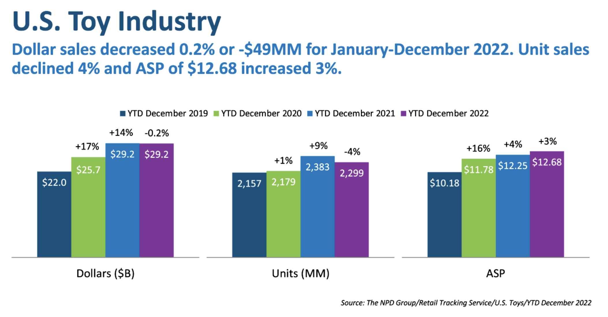 Globally, the toy market remained strong in 2022. Across the 12 global markets tracked by NPD, toy industry sales grew 2% year to date through September 2022 to $36.7 billion, and were 30% higher than in 2019, suggesting that interactive and play-based products had moved beyond an emerging trend into a more established market. (Source: The NPD Group / Circana)